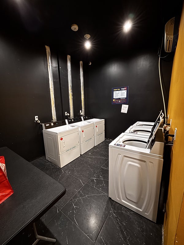 Apartment is partially furnished with a couch, TV stand, dining table, kitchen storage and bathroom storage. Building amenities include a trash chute, gym, shared laundry room, rooftop access and a parking garage if needed.