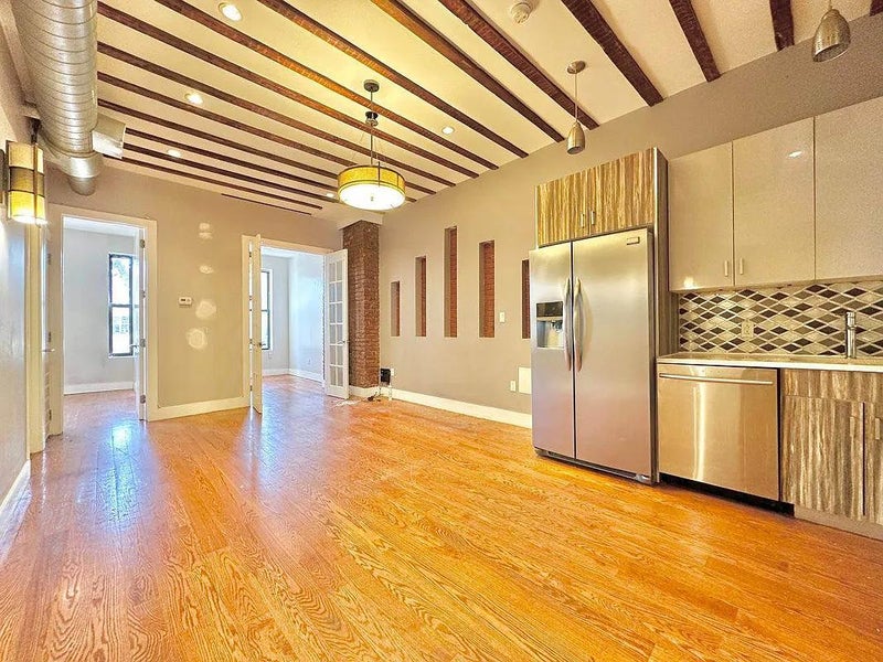 Spacious unit with lots of natural light, in-unit washer/dryer, massive living room with exposed brick and wood studs, and stainless steel appliances including a dishwasher.