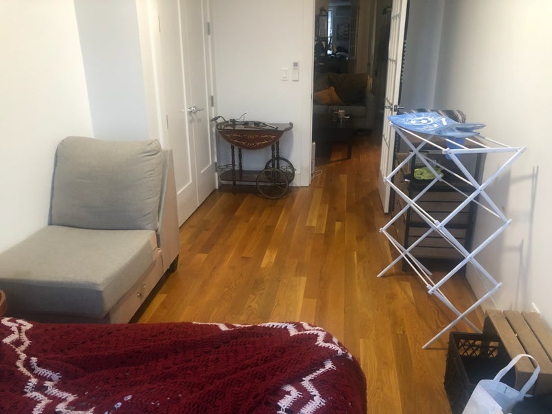 Large semi-furnished room in third-floor 3BR1.5BA walkup available for April sublet. Spacious apartment with living room, dining table, large kitchen, one full bathroom and one half bathroom. Would be sharing with two lovely roommates who are out of the house most of the time and a shy but friendly cat. Split-unit heat/AC, large closet in the room. Great central location on Knickerbocker Avenue.