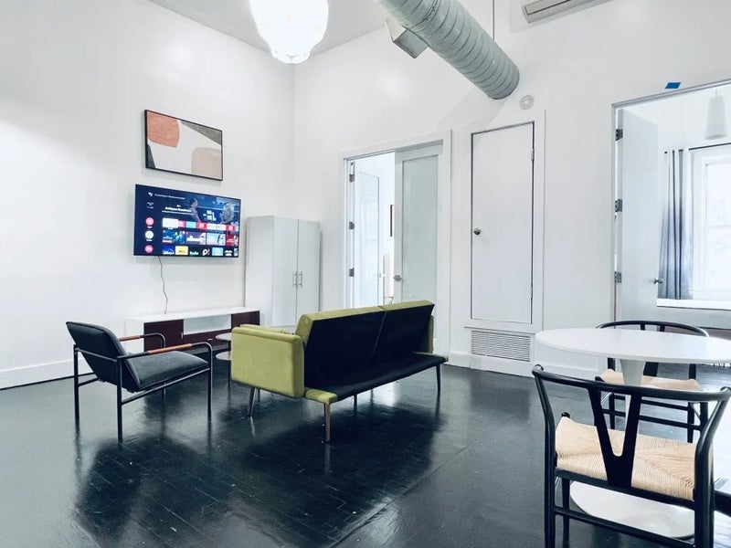 This private Queen room in a 5 bedroom / 2 bathroom apartment, located in Bushwick is available on a flexible 1-18 month lease - Furnished room with double height ceiling (14 foot ceilings), Central AC, 1.5 bathrooms, large closet. - Furniture: bed, mattress, dresser, desk, chair, TV, lamp, closet, curtains - Trains L and J at Halsey train station, 23 min to Manhattan - 4 minute walk to Irving Square Park, 4 minutes to grocery, 6 min to shopping - Location: Weirfield St and Evergreen Ave - $195 monthly utilities expense (Internet, gas, heat, hot water, electricity) - $40 monthly cleaning - There is a one-time room cleaning and administration cost of $175