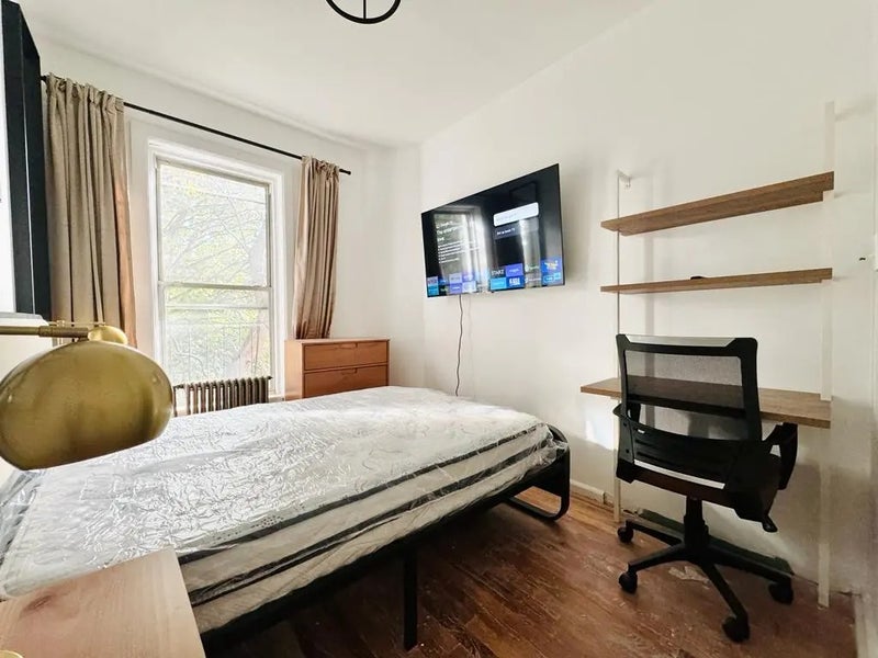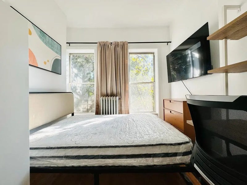 This private Queen room in a 4 bedroom / 1 bathroom apartment, located in Bedstuy, is available on a flexible 1-18 month lease Van Buren St – #601 - Bright bedroom with high ceiling in Bedstuy, right on Van Buren St and Throop Ave (3.5 blocks from Bedford Ave). Room has a HD TV, dresser, desk, chair, Wifi and a large closet. - 12 min walk to G train, 16 min to C train, 29 min to Manhattan, 2 min walk to Herbert Van King Park. - We are looking for someone who is clean, responsible with good energy. - Utilities are $170 per month (internet, gas, heat, hot water). - $40 monthly cleaning - Restaurants, cafes, bars, salons are 5 minute walk. - There is a one-time room cleaning and administration cost of $175