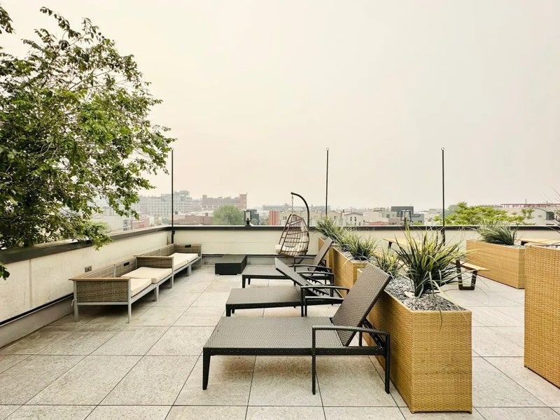 This private Queen room in a 5 bedroom / 1,5 bathroom apartment, located in Bushwick is available on a flexible 1-18 month lease - Furnished room in a 5 bed, 1.5 bath, duplex (2 floor) apartment with balcony and AC, 18 min to manhattan, prime Bushwick, brand new luxury building with laundry, gym and rooftop, nice view of the manhattan skyline. - Trains: 5 min walk to M train at Central Ave station, 7 min walk to J & Z trains at Myrtle Ave station, 13 min walk to L train at Morgan Avenue Subway Station. 18 minutes to Manhattan. - Furniture included: bed, mattress, closet, dresser, curtains/shades, desk, chair, sofa, kitchen table. - Washer and dryer downstairs in building. - On the same block as cafe’s, restaurants, gym, bars. - Utilities: $185 per month (internet, gas, heat, hot water). - Location: Willoughby Ave and Evergreen Ave. - There is a one-time room cleaning and administration cost of $175