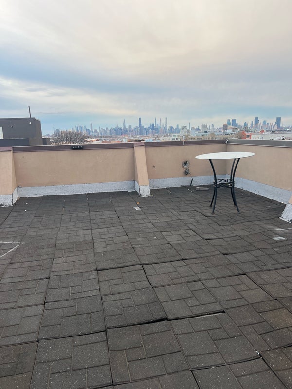 The apartment is a second-floor walk-up with a modern kitchen, brick accent living room, laundry in building, and rooftop access with skyline views.