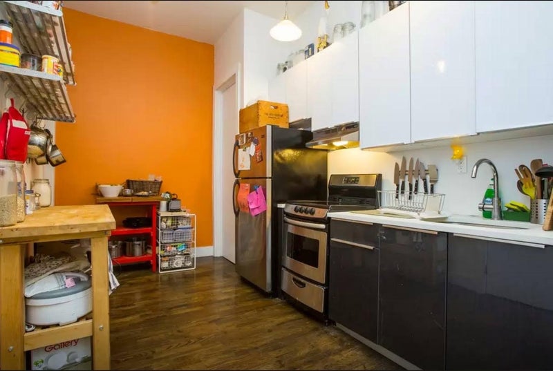 We all pitch in for occasional runs to Costco for bulk goods so basics are always covered. The apartment is the full 1st floor, basement, and private backyard of renovated building in Bushwick: 6 bedrooms, 1 full and 2 half bathrooms, full refrigerator, electric stove washer/dryer in apartment, and HVACs in each room. We live with 2 sweet dogs named Joker & Lulu :0)