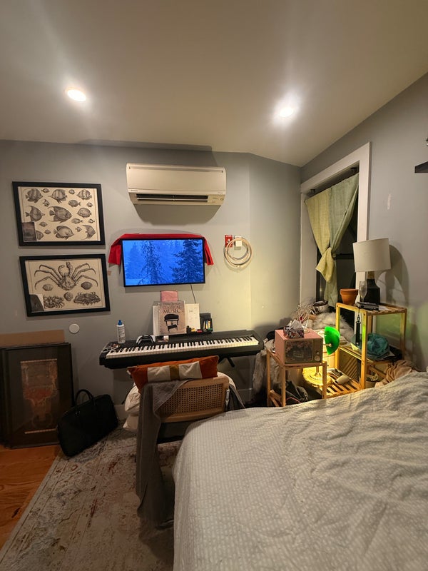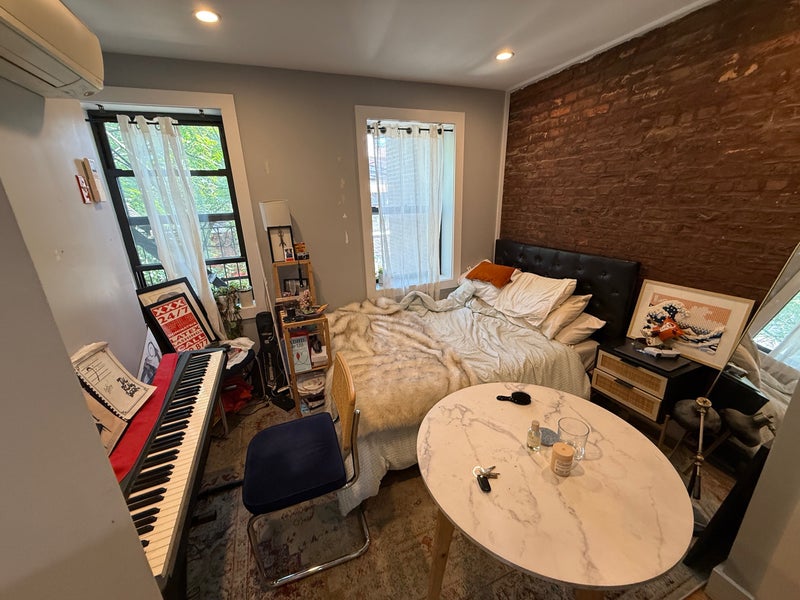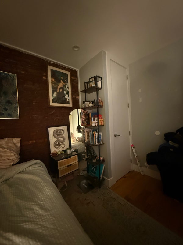 The Room Your space is the back right bedroom with a brick wall, nice morning light, and real character. It comes partially furnished (bed frame + mattress with under-bed storage, in-closet mini cabinet), and I’m happy to sell some of the other items pictured if you’re interested.