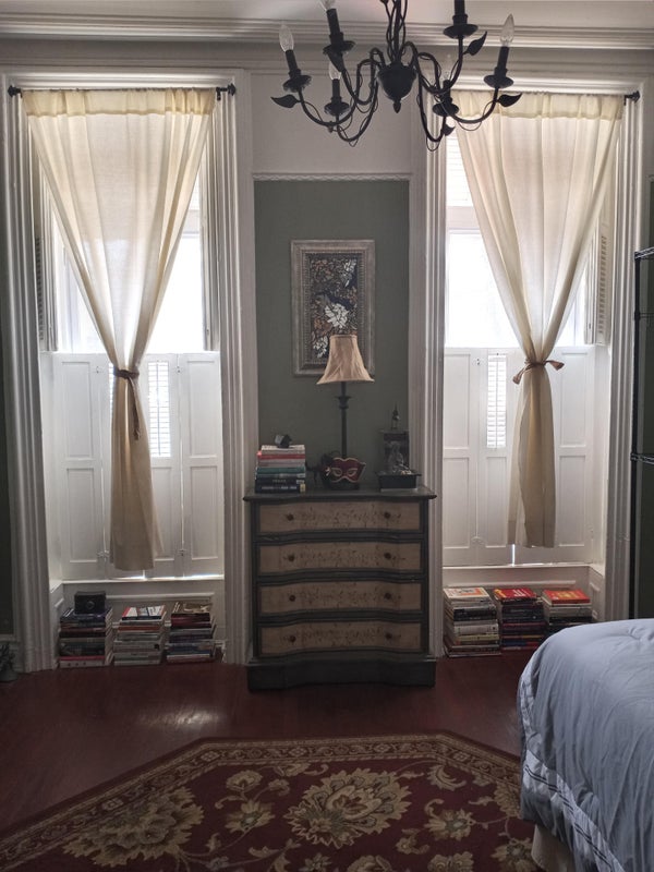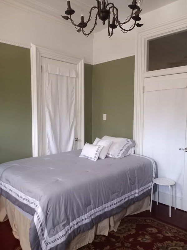 The apartment has tall ceilings and oversized windows that allow for a million rays of sunlight. It comes with a full-sized bed, a small dresser, and a desk and chair.