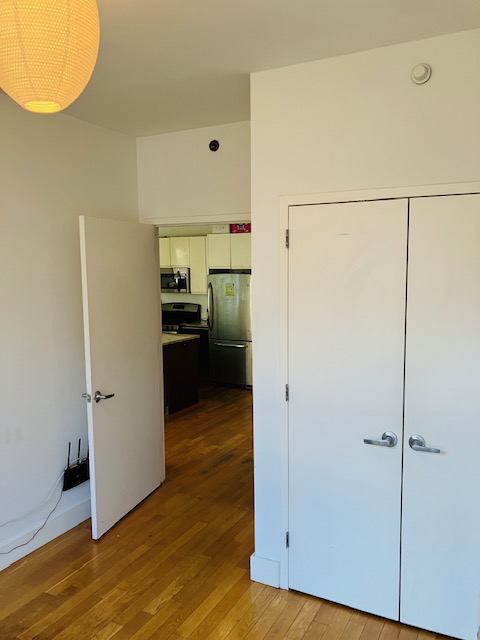 About the place: The apartment is in a luxury building with a gym, a media room, and laundry in the building. The room is furnished with a desk, dresser, and double-bed. Also, the room has high ceilings and a good-sized closet.