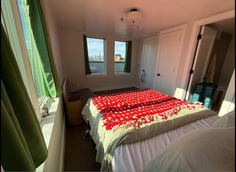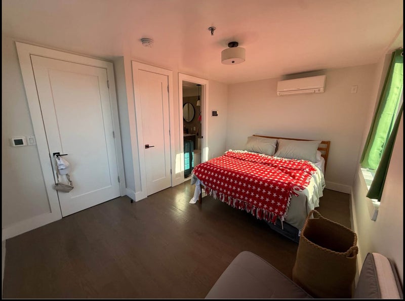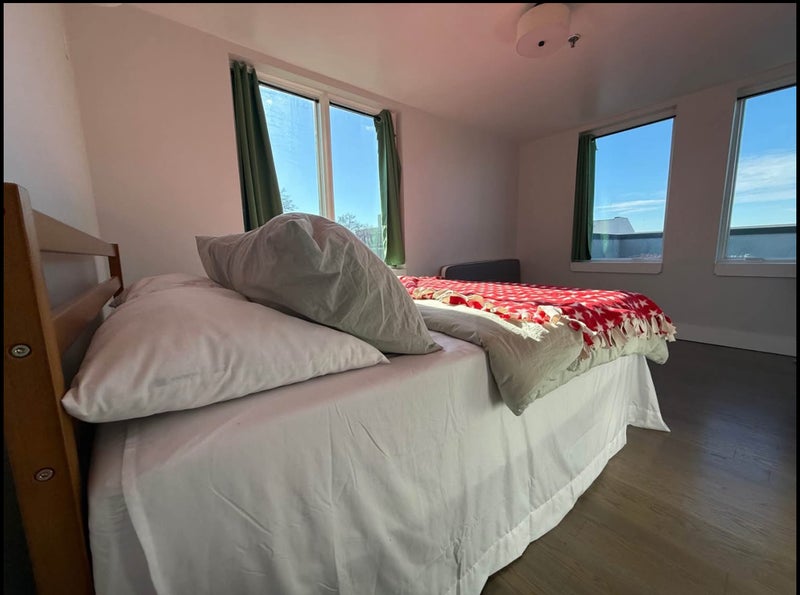 This room is on the top floor, separate from the other rooms. It’s the largest room in the unit, has multiple windows for lots of natural light and has its own private bathroom and balcony.