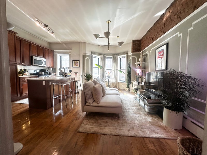 -Gorgeous hardwood floors and soaring ceilings throughout -Expansive windows flooding the living area with natural light -Open kitchen with marble island, stainless appliances, and dishwasher -Sonos sound system in common areas -Generous closet and storage space -Second floor of a quiet two-family rowhouse on a tree-lined block