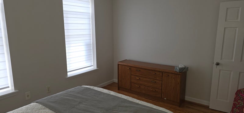 The Space Your Private Retreat: A bright, airy 14’ x 10’ furnished bedroom with a queen-sized bed plus a dresser and nightstand.