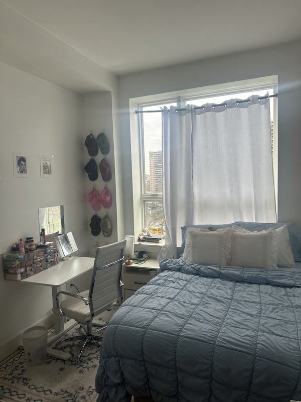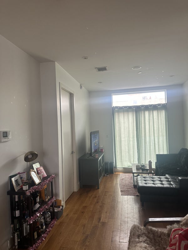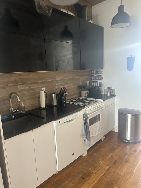 Full size room with large closet becoming available from May 6th. Available to sublet from May 6th to July with option to sign in to a year long lease in July. Laundry facilities, gym, rooftop terrace all included in building facilities. Walking distance from L, G, and JM subway stations. Fully furnished comman living area with kitchen appliances and utilities. Living with two males in their 20s both with full time jobs.