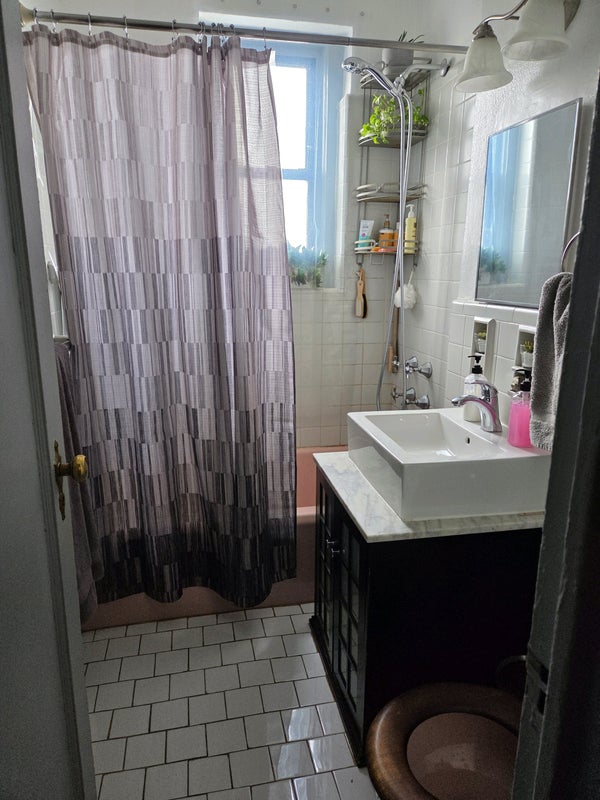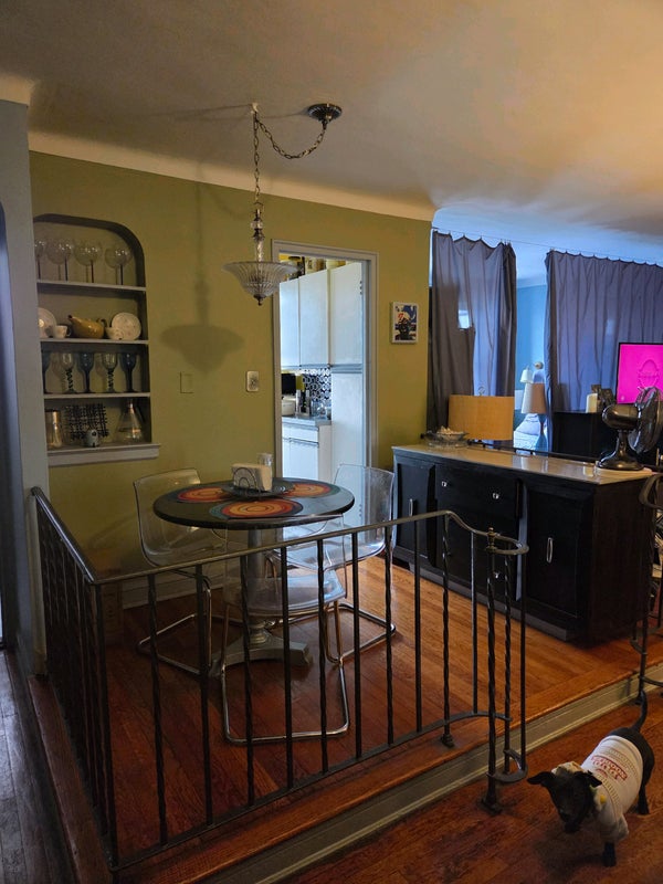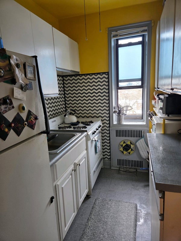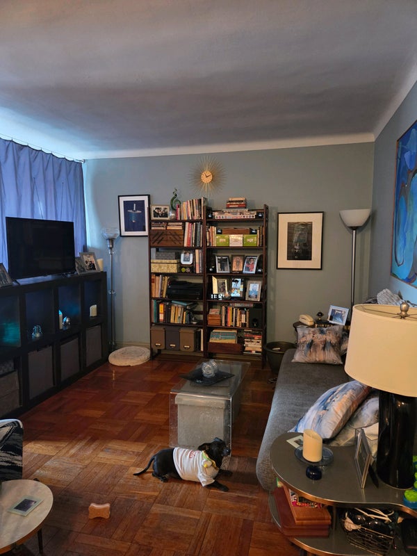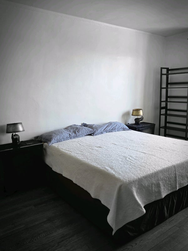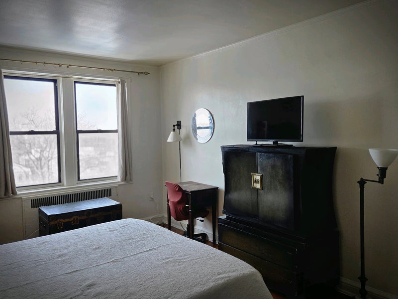 Large, furnished room with a king size bed, monthly rent is $1200 all in, available February 15th. There are 2 closets and a clothes rack, there is also an AC and TV. It has hard wood floors, a large 5 drawer dresser, 2 spacious night stands & a steamer trunk for storage. There is also a bookcase with 6 shelves & a small desk, with 4 lamps. There is enough room for a small sofa or chair. The apartment is on the top floor of an elevator building and it has GREAT views of the Verrazano Narrows Bridge. The living room is divided in half with a curtain that separates my bedroom (it is not a 2 bedoom, it didn't have 1 bedroom as a choice), half is private and half is shared. The bathroom and kitchen are shared. The bathroom has a big, old, comfy cast iron bathtub and it has been renovated. I prefer a roommate that doesn't drink much. No smoking. I have a small dog that is very friendly and likes to play fetch. Keever is sweet and well trained. The building is on a cul-de-sac with trees and a grass meridian down the middle. It is 1 block from the Q Train at Avenue H and the express Q/B stop at Newkirk Plaza is 6 blocks away. Di Fara's which considered some of the best pizza in Brooklyn is a few blocks away. Sunday there is the Cortelyou Road Farmer's Market and there are great restaurants on Coney Island Avenue & Cortelyou Road. I'm located 3 blocks from the back of Brooklyn College and it's 25 minutes by subway to lower Manhattan.