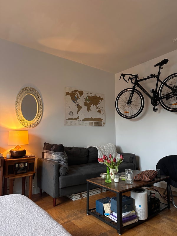 Bright spacious room with everything you need: queen size bed, a desk, a couch, small tv and a coffee table. Everything is included in the price (electricity, wifi, water, gas). The roommates are really nice people, we have a schedule of cleaning an entire apartment once a month and you should be okay with it. Also you should be fine with watering and caring for my plants. NO PRIVATE BATHROOM