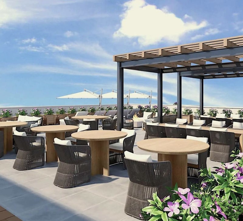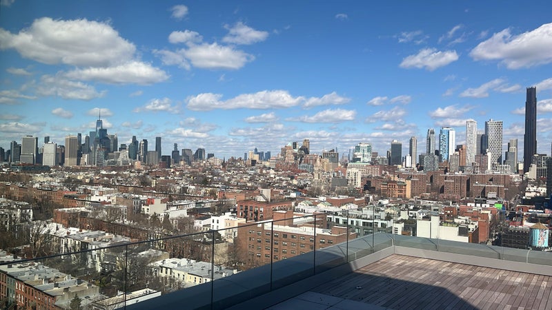 Roof terrace with stunning skyline views of Manhattan and Brooklyn gym co-working spots Cafe Film studio Sauna Lounge private dining back yard area 24/7 doorman