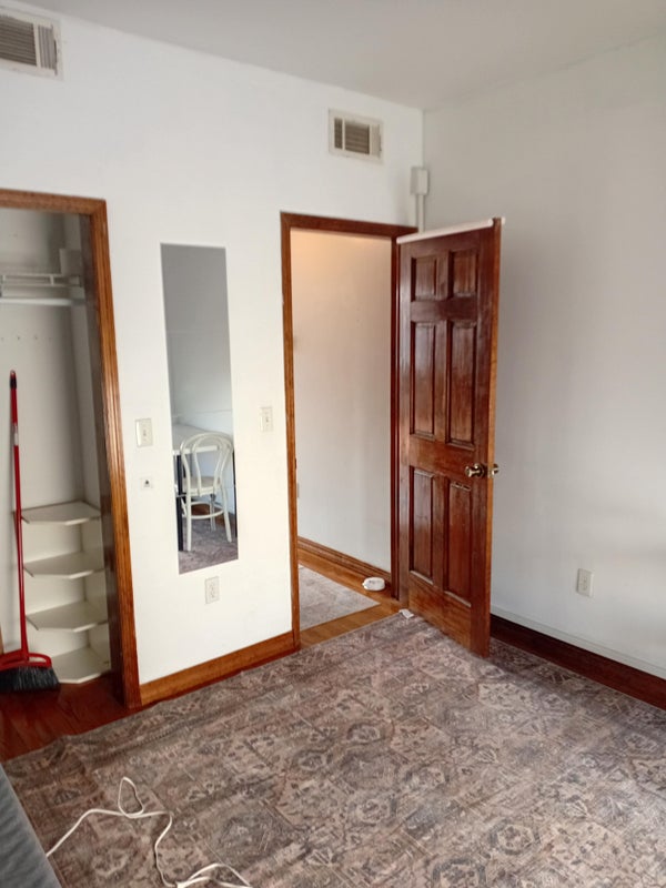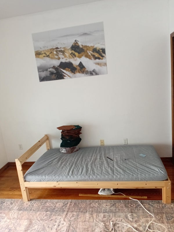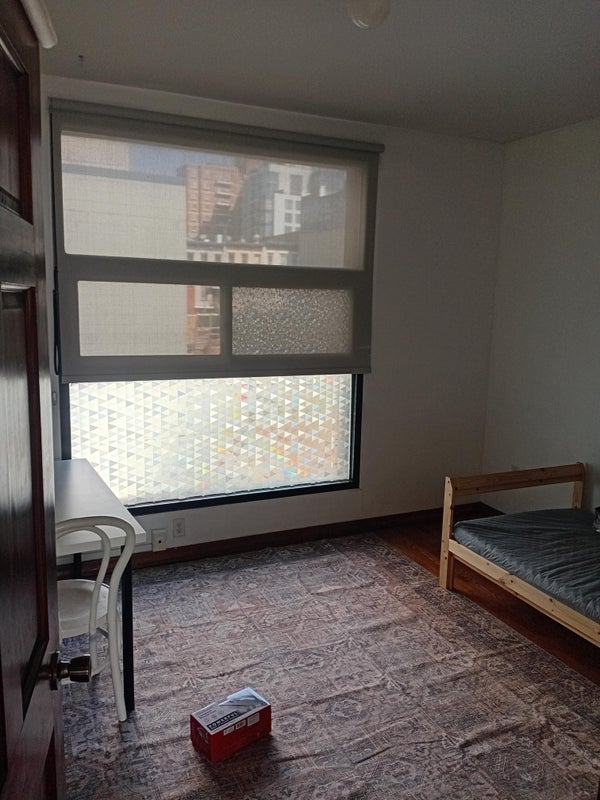 10x12 Room. Furnished with small Ikea bed and a desk. I live here too. I would prefer a 9-5 kind of person as I'm here in the day and gone often at night. I play the upright bass and I work at a jazz club.