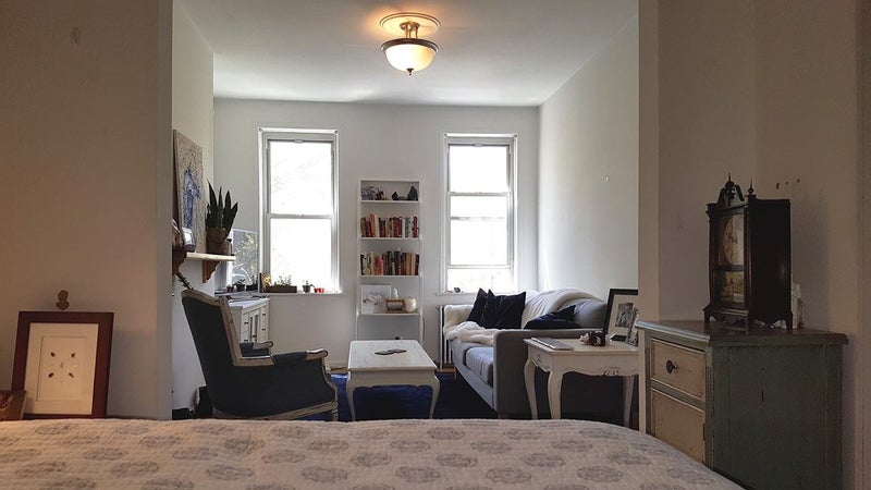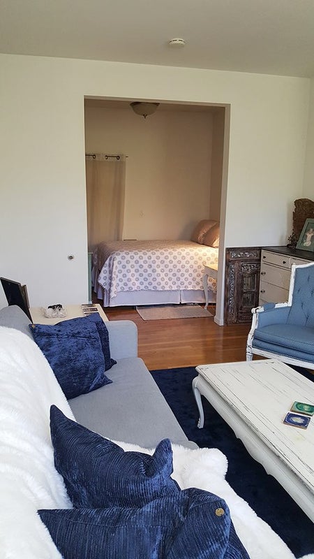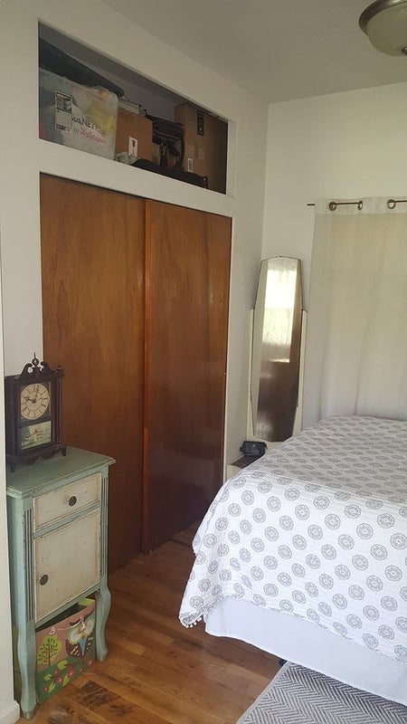 This is long room separated by a large doorway so you can create a BEDROOM AND LIVING ROOM for yourself (see pics). You can fit up to a queen size bed in the bedroom area. There is a separate entrance from the hallway, and we would share the kitchen and bath. There is a nice size closet in the room. The building is well maintained.