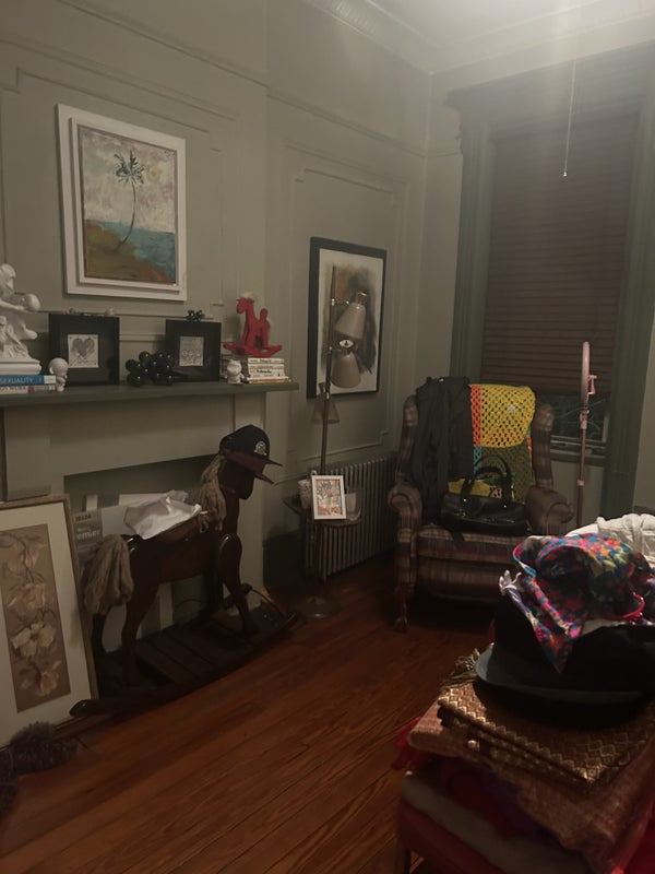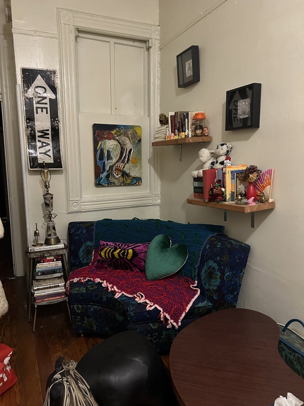 The apartment: Art filled, eat in kitchen, living room with 2 loveseats, tv, and coffee table.