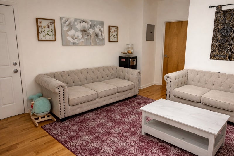 This one-bedroom apartment shares a living room, bathroom, and kitchen. We are seeking respectful individuals who are mindful of noise levels, as the apartment is situated above an office.