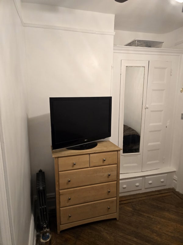Roommate Bedroom: Newly renovated 10 x 12 bedroom; unfurnished, 9ft ceiling, parquet wood floor, new plaster and paint, new radiator, one 7'tall window with screens, large built-in closet (largest closet in apartment). Upgrades include ceiling fan, window air conditioner, 1 G Ethernet connection, wall-mounted drying rack.