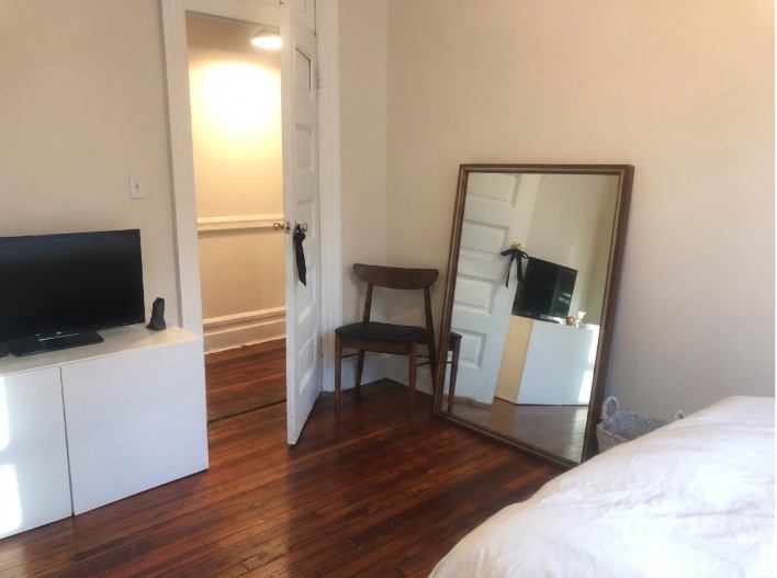 The available bedroom is approximately 10x13 (130 sq ft) with its own closet and comfortably fits a queen (even a king), dresser, and desk. It gets natural light and is positioned at the end of the apartment, so it feels private and quiet.