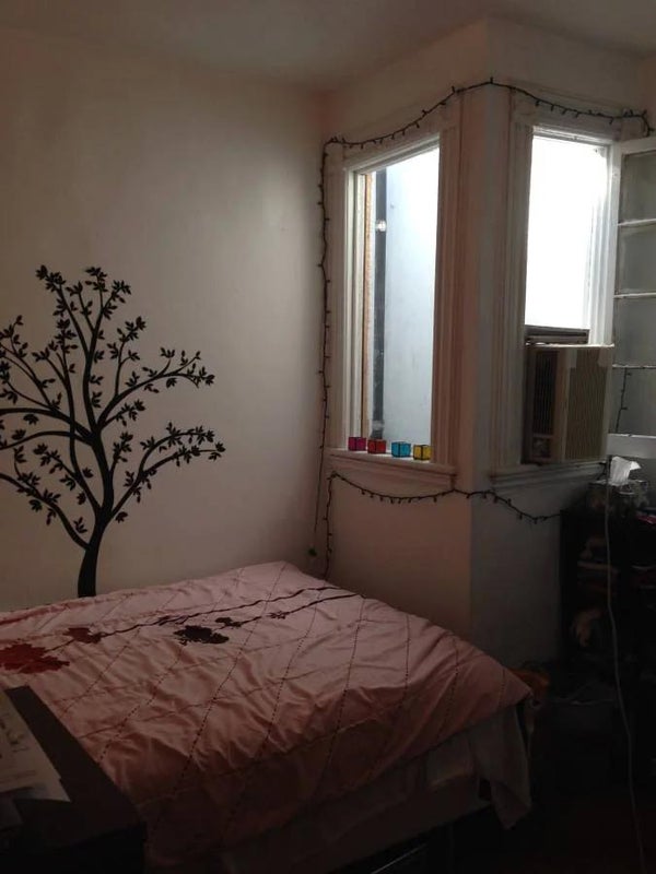 The bedroom: • Medium-sized room with a closet • Dimensions (approximately) 12’ by 7’, but also includes a 3’ by 3.5’ alcove. There is plenty of room for a full size bed (which is what is in it now) and a few pieces of furniture. • 2 windows that lead to an air shaft with a skylight at the top. (There is natural light, but the windows do not open to the outside.)