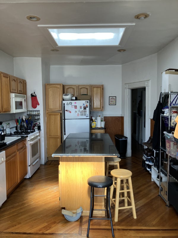 About the apartment: • 4th floor of a walk-up building (three flights up) • In-unit full-sized washer and dryer • One and a half bathrooms • Large open living room and kitchen with 2 skylights. • Kitchen includes granite countertops, a large island • Shared office/library next to living room • Hardwood floors throughout • The bedrooms are located in the rear of the apartment so they are quiet.