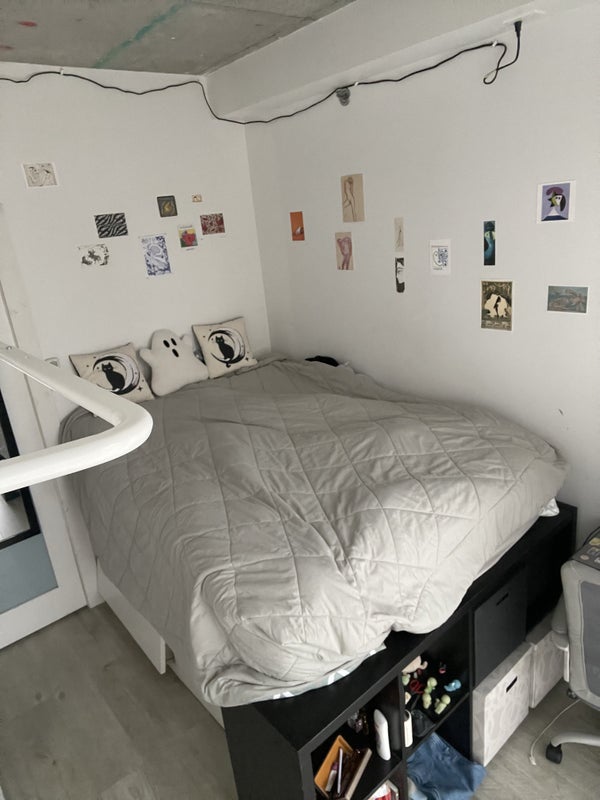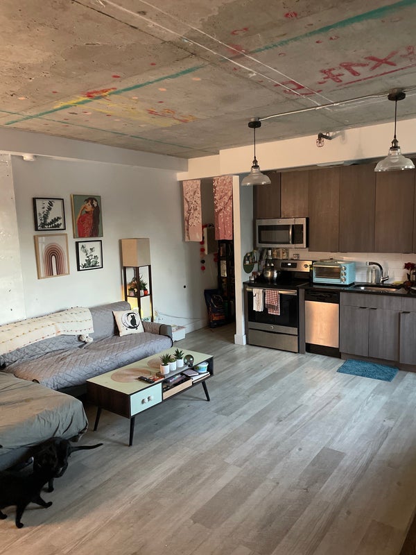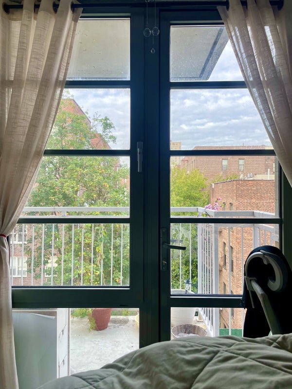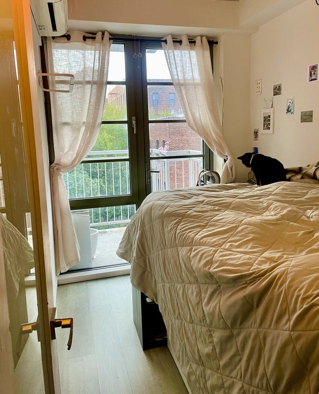 Available May 1st! __The Apartment__ 3 Bedroom apartment. Your quiet and bright room is furnished with a full sized bed. You also have direct access to the balcony. The room has its own AC/Heater. The rent includes rent and wifi. __The Building__ The brand new building is quiet and clean. The basement has a laundry, gym, common space for working, a music studio with drums & guitars, and a small movie theater room. The roof is very nice and the view of the skyline is gorgeous at sunset. __Quick Bio__ Catalina and I are both native NYers, roommates and friends. We work a lot, like to cook/watch movies in the living room but pretty low key. __Animals__ We do have pets: one very affectionate cat and one shy American Foxhound dog.
