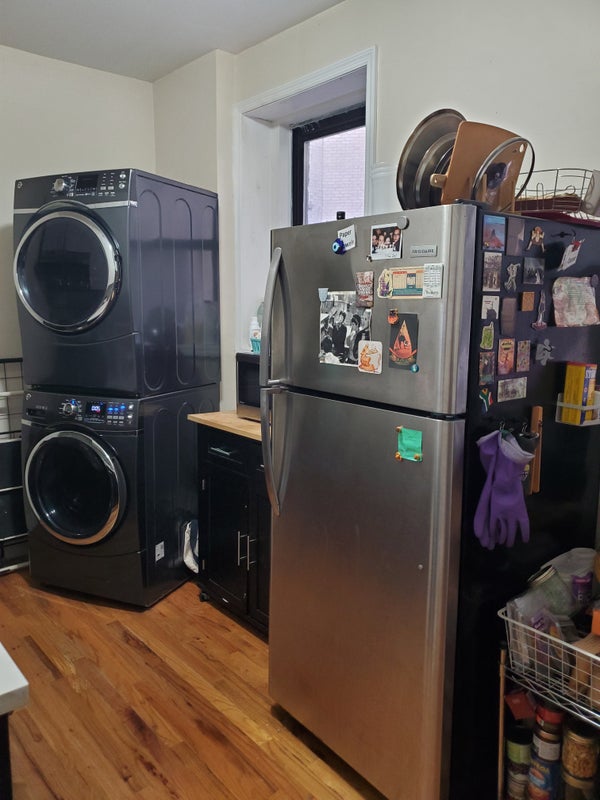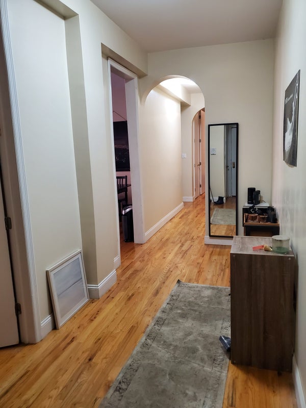 We're in a spacious three-bedroom, one bathroom, rent-stabilized apartment with laundry in-unit and high ceilings in Prospect Lefferts Gardens/Flatbush. Close to the Q, 2, and 5 trains, and a ten-minute walk from Prospect Park. Apartment is COVID conscious and currently pet free (no cats, please, one of us is tragically allergic!) and smoke free.