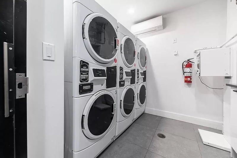 The building offers a full range of amenities, including an elevator, on-site laundry, fitness center, bike storage, private parking, and a furnished rooftop with open views.