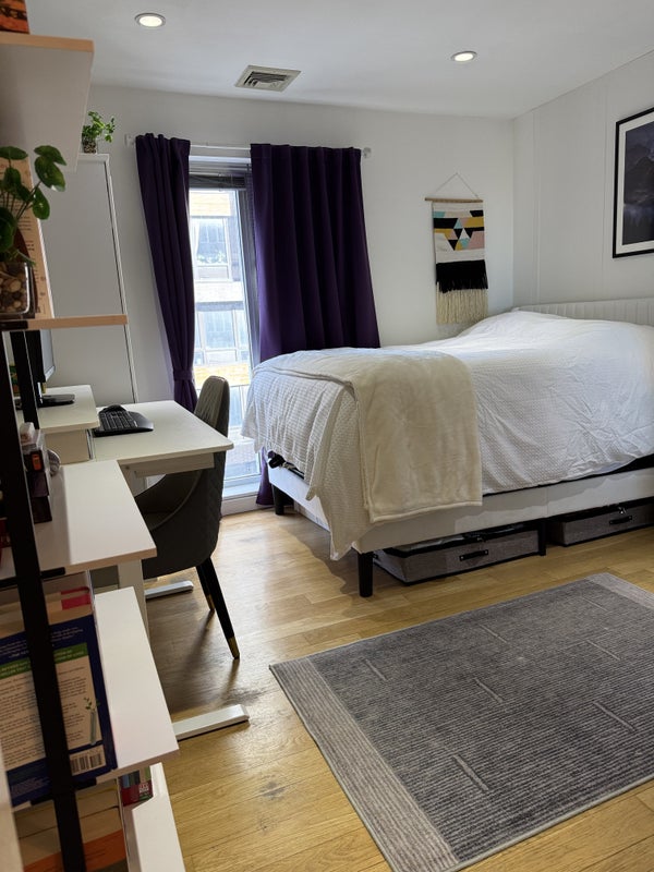 The Room Comfy space with a 6th floor view of the city from the nearly floor-to-ceiling window. It's perfect for a queen-size bed and has hardwood floors and a bright, beautiful en-suite bathroom. The room is not furnished.