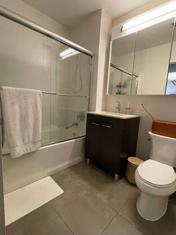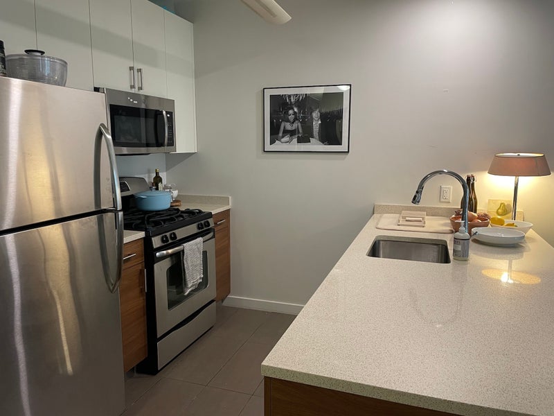 Our third-floor unit is fully furnished and equipped with a dishwasher, in-unit washer/dryer, A/C + heating, walk-in closet, and handheld shower. The building offers a gym, 24-hr doorman, and Amazon locker for secure package storage. There's also an online portal for maintenance requests, which are tended to within 24 hours. We love the team here!
