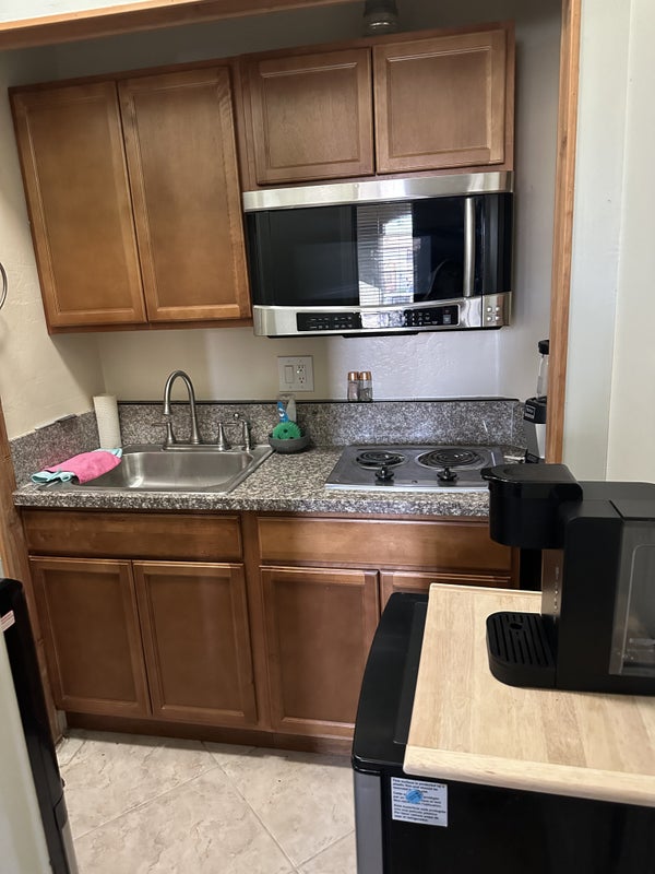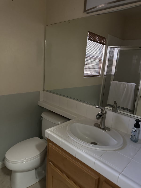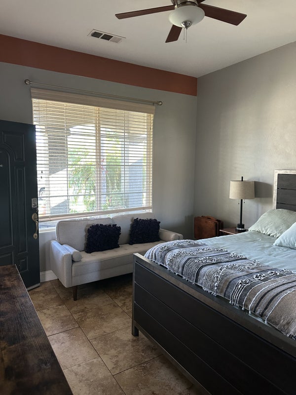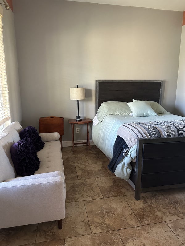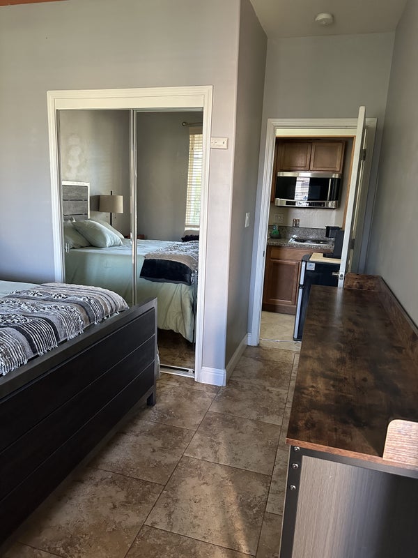 The property is a mother-in-law studio apartment attached to a house, providing privacy and a separate living space. The bedroom is furnished with a queen-sized bed, a regular closet with sliding mirror doors, and a dresser, offering ample storage for your belongings. You will also have access to a private bathroom with a convenient walk-in shower and a single vanity.
