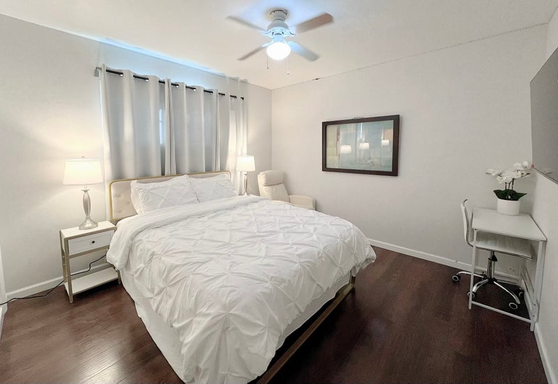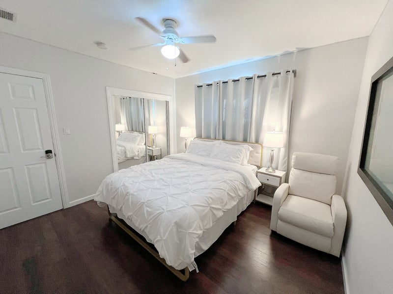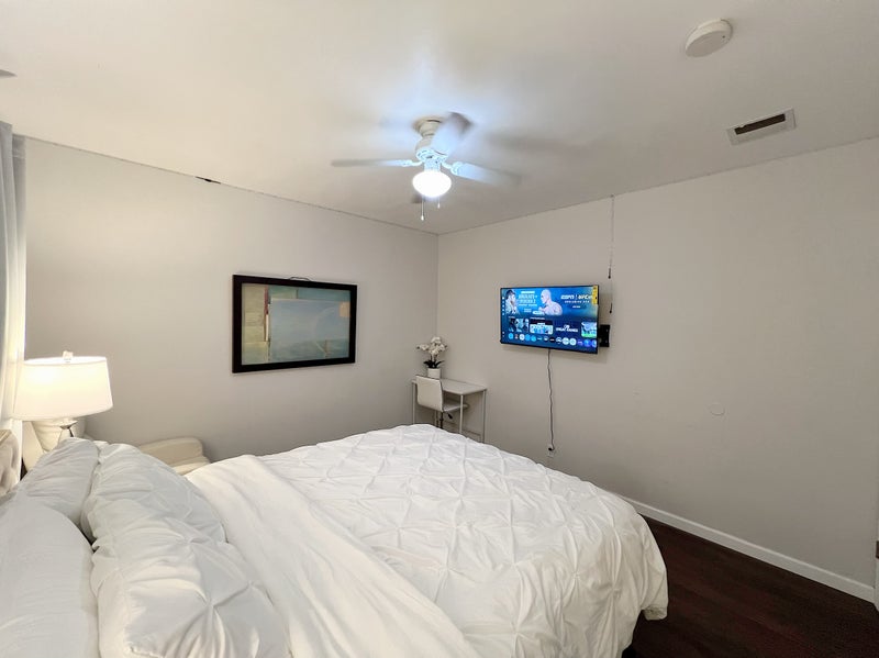 Brand new queen-sized bed with fresh linens for a restful night's sleep. It has a smart TV, brand new mini fridge to store your snacks and beverages. A new recliner where you can lounge in comfort. Easy Bathroom access, located right beside the room for convenient use.
