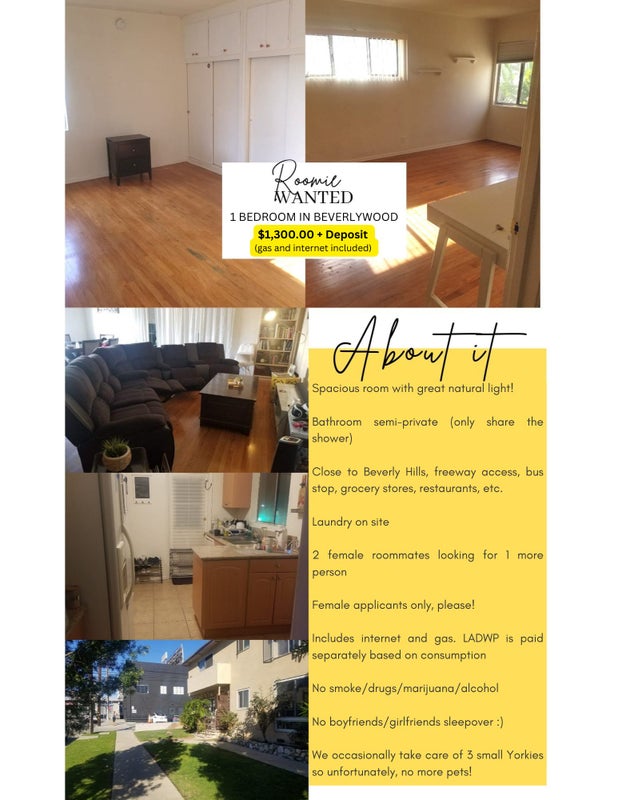 Rent: $1300 + deposit Utilities: ~$100–$150/month (not included. LADWP, Internet, and SoCal gas) Street parking