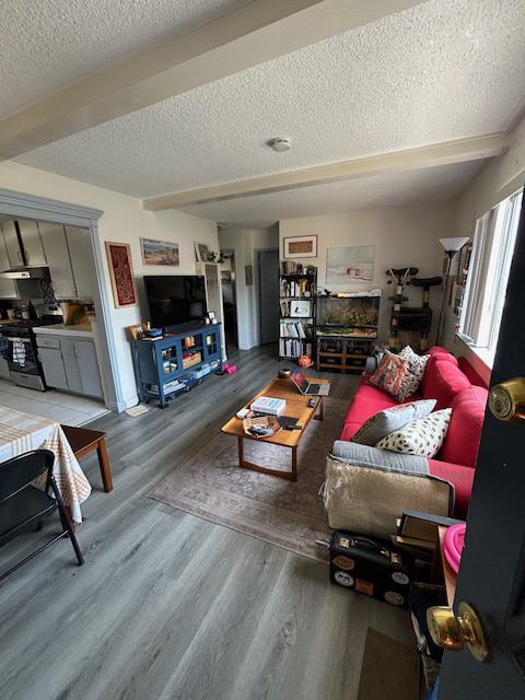 The kitchen is big for those who like to cook and the bedroom itself has a decent sized closet, a small window and an A/C unit. The living room is furnished and the kitchen has all necessary pots/pans/dishware, etc. but if you have furniture, kitchen stuff etc. you want to bring we can discuss.