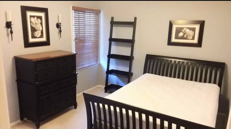 Beautifully furnished quiet room has a TV, Queen bed, two dressers, bookshelf and full length mirror. Lot's of closet space and room under bed for storage.