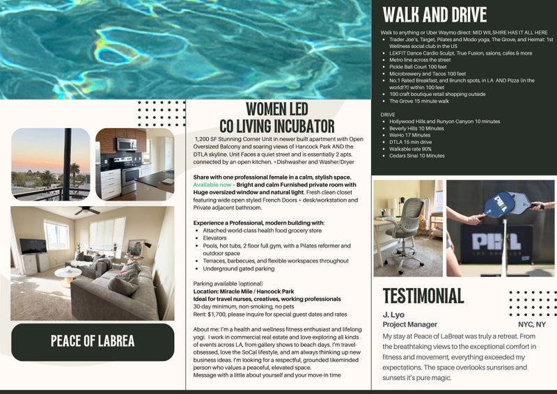 I’m join me and share this incredible space this is the place to grow your passion and be the professional you are. I’ve lived here for more than seven years and I can tell you this unit apartment is the best it faces a quiet street is on top of the grocery store and has every minute amenity you can ask for with driving distance to anything within 20 minutes. Your room is fully furnished and ready for your future in a kind well traveled world class professional looking for you. you will have your own bedroom with two closets, fresh linens, private bathroom and anything else you need. The space is large and connected with an open concept kitchen 1200 ft.² beautiful balcony with Wi-Fi. The location is inclusive of pools hot tubs grills Terrace’s and social interaction as well as peace if this sounds like a good well aligned fit for you and come join me for the next page turn!