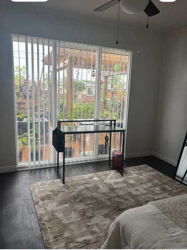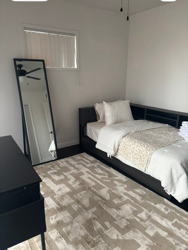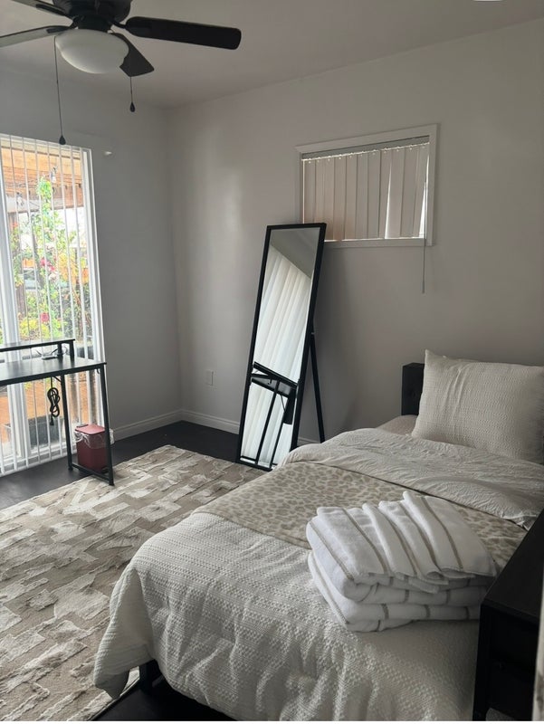 Looking for nonremote, chill, clean, nonsmokers. NO recreational including vaping. New twin bed. Never used. New towels and a large narrow closet. Vertical blinds with a view to a zen patio with a hammack. Shared bathroom. Access to a full kitchen, 2 refrigerators, own pantry, washer and dryer in house with street parking.