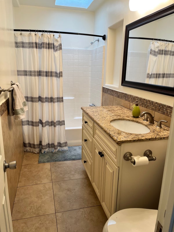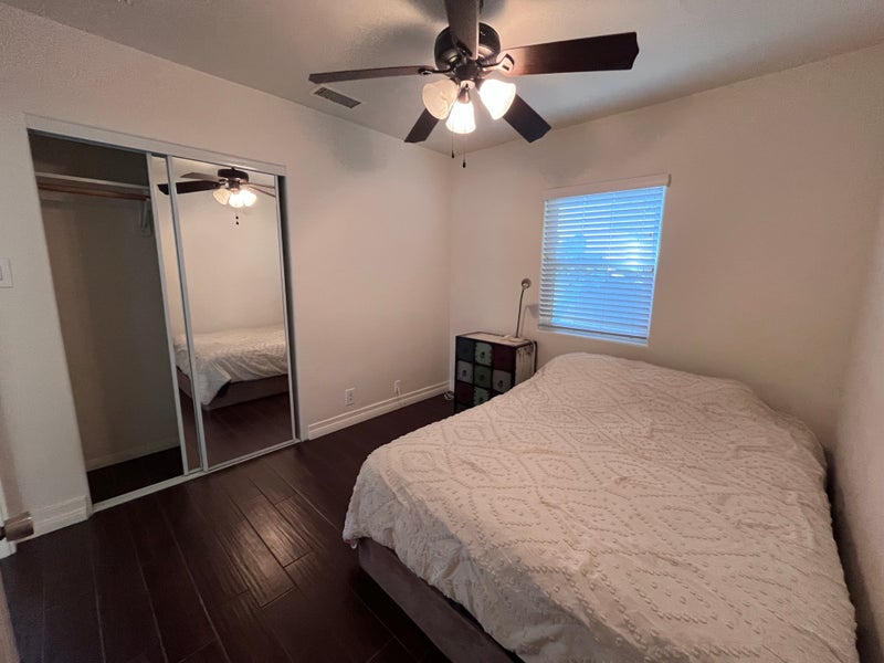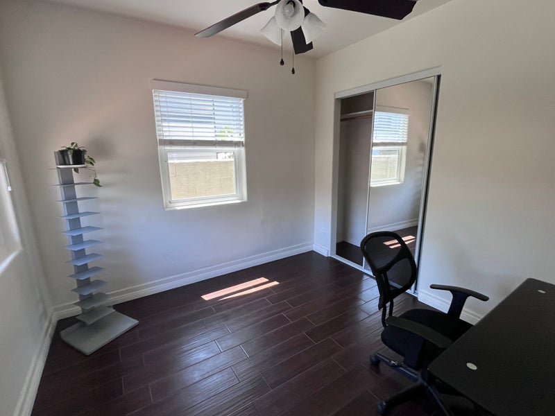 YOUR PRIVATE SPACE: * Lightly furnished bedroom (bed, dresser, lamp, nightstand) and furnished office/flex room (desk, chair, lamp, bookshelf) — 171 sq ft total * Dark hardwood floors, ceiling fans, mirrored closets in both rooms * Your own full private bathroom with granite countertop and skylight * Additional personal furnishings welcome at your own expense
