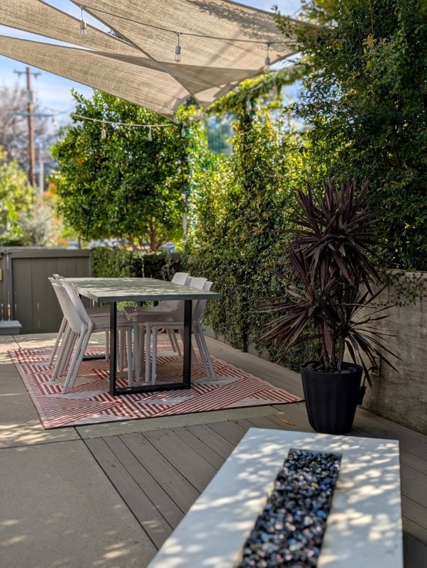 Large fenced-in front patio off the living room with dining, and gas firepit seating areas. Inside you'll find the open concept downstairs kitchen and living room. There is also a half bath located downstairs. Access to a L2 Tesla charger is needed.