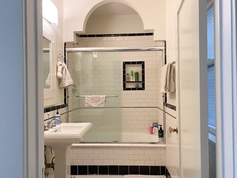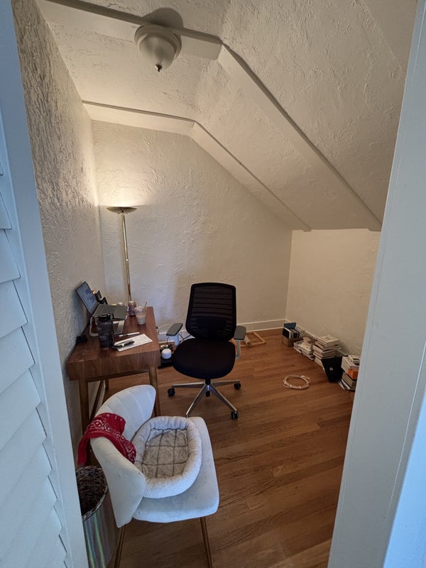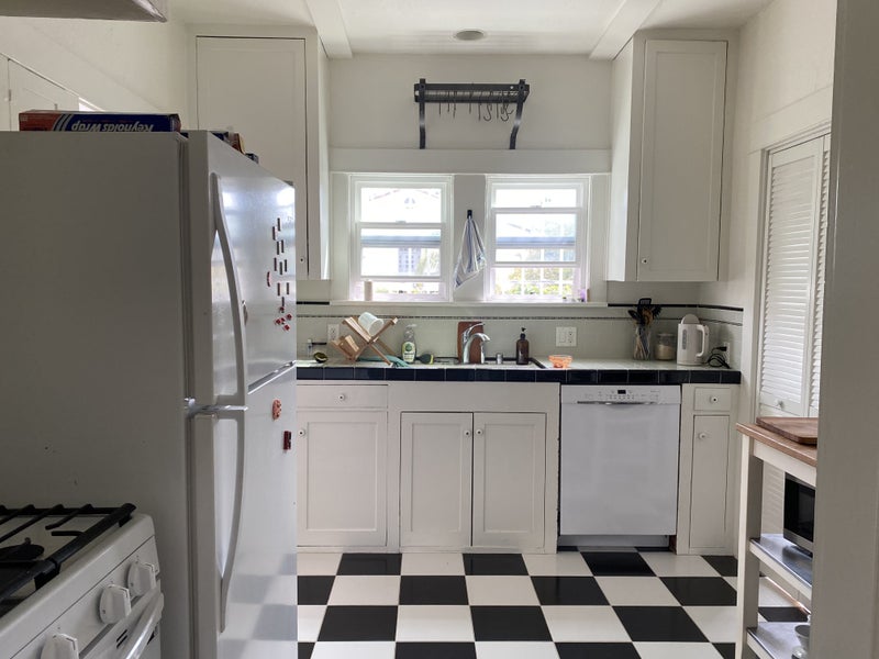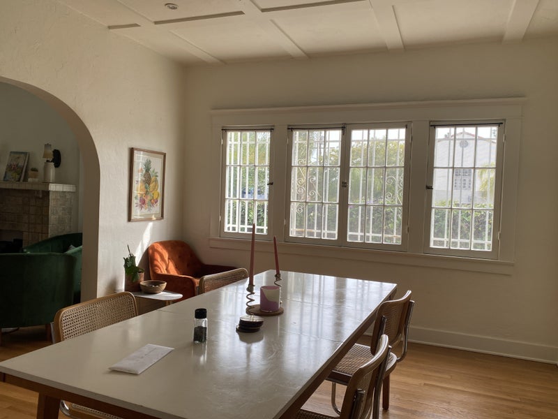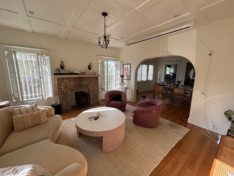 The apartment has classic 1920s Spanish-style details — arched entryways, high ceilings, and tiled kitchen and bathrooms. The living room also has a projector setup for movies, TV, and video games. Small office space under there stairs. There is one cat in the home, and I’m open to living with another small pet.
