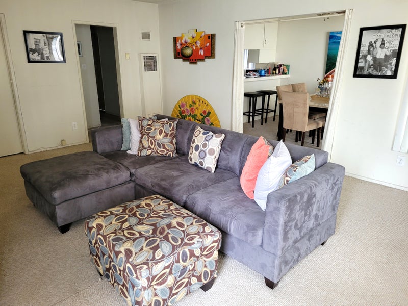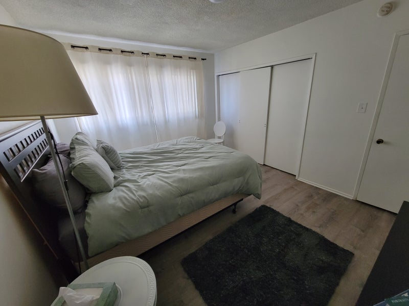 Furnished private bedroom available in a clean, quiet home. The room includes a queen bed with headboard, chest-of-drawers, mirror, chair, air purifier, lamp, rug, bedside stand, window curtains and large closet.