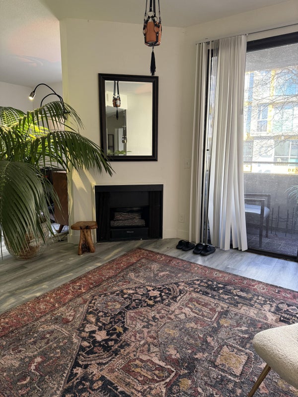 The room is open and airy with two large closets and a private en suite full bathroom. The apartment itself is 1100 sq ft with a living room, a den with couch and smart TV, a full kitchen, dining area, and a balcony. The apartment comes with a parking space and utilities are included.