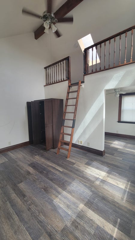 The available room is recently remodeled (new laminate, new blinds). Includes a loft, essentially enough space for a sleeping area, work area and sitting area. All utilities included + monthly professional cleaning of common areas. You have to see it to appreciate it!
