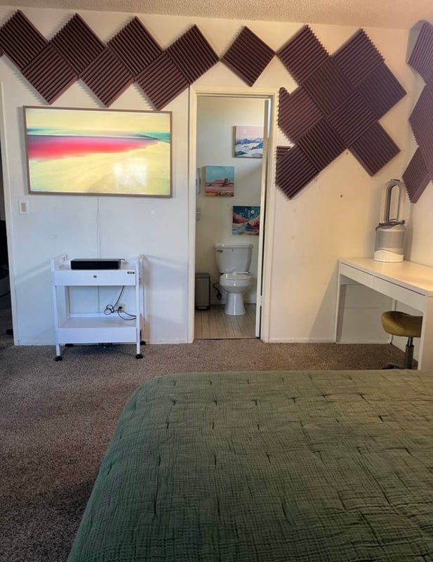 🏠 The Space • Private bedroom + private bathroom in a spacious 3BR / 3BA home • Room size approx. 14 × 14.5 ft — large, easy to furnish • Top-floor corner room with no shared walls • Windows face trees with excellent natural light and cross-breeze • In-unit washer/dryer, dishwasher, high-speed internet • Full access to kitchen and living areas (shared spaces kept tidy) • Coway water purifier (cold, room temp, and hot) • Shoes-off household; carpets professionally cleaned last year • Optional furnishings available: queen/king bed, Samsung Frame TV, dresser, desk • Quiet street, walking distance to coffee, food, and groceries