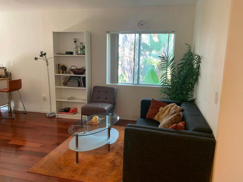 The bedroom has its own bathroom and closet. The shared living spaces are the living room, balcony, mini kitchenette (not a full kitchen only sink, fridge, electric stove, and microwave.) No laundry on site.