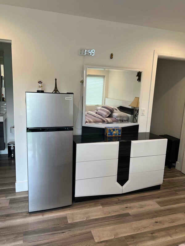 One bedroom , one bathroom with walk in closet . King size bed with reclining mattress base. Comfortable mattress ’. Big dresser with big mirror, night stands. Smart new TV, Medium size Fridge with freezer,Microwave , toaster , water filter, electric oven ,electric presscooker, slow cooker and kettle ( Kitchenette). Walk in closet. Luxury private bathroom with nice vanity . Small dinning table with chairs. Luxury desk chair .BBQ with dinning area outdoor gas stove with burners and chairs outside. Free street parking . No pets allowed . Central AC heater. Ultra fast internet Giga with smart mesh.Nice garden in the front door.