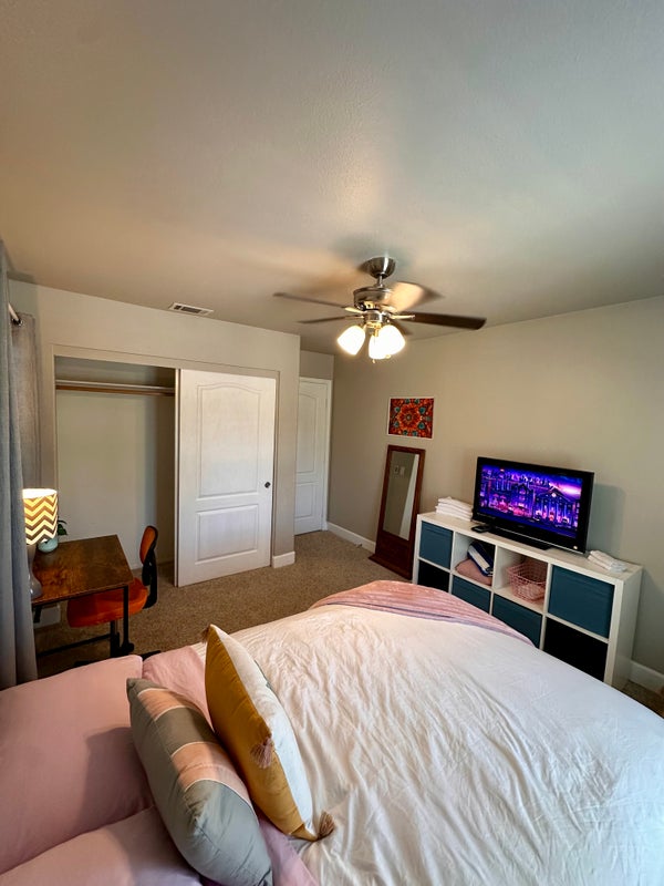 Room includes Full Sized bed, mattress, outlets, desk, desk chair, streaming tv, bedding/blankets and towels, plus laundering of said items.