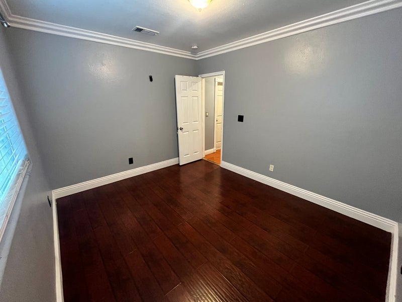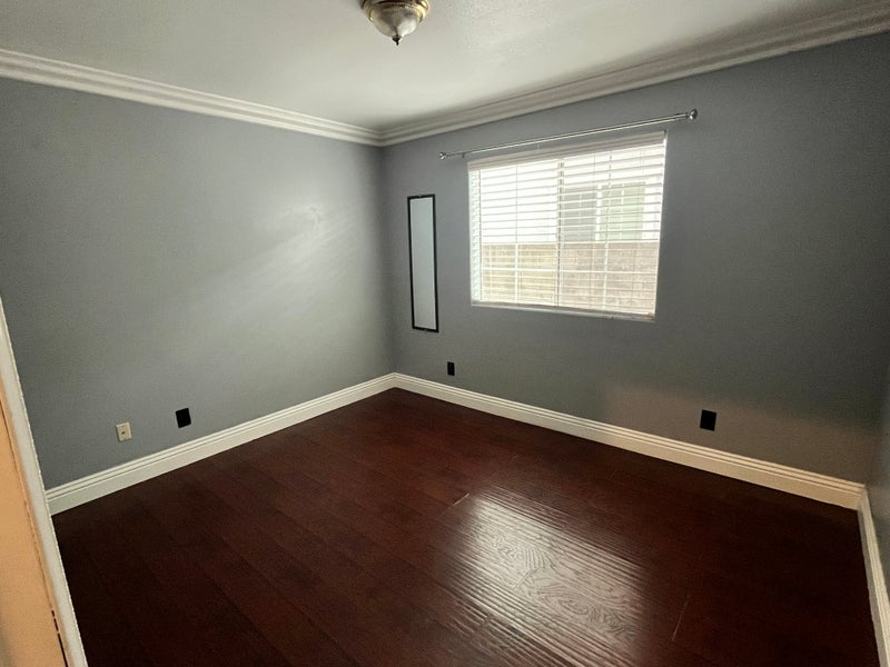 The available room is separate from the other bedrooms, offering extra privacy, and is located near the garage and laundry area. It features laminate wood flooring and a large window. While there is no closet, the space easily accommodates dressers and storage pieces. Garage storage is available directly beside the room if needed.