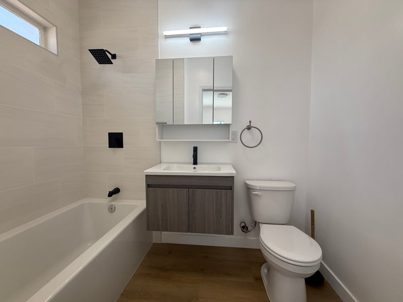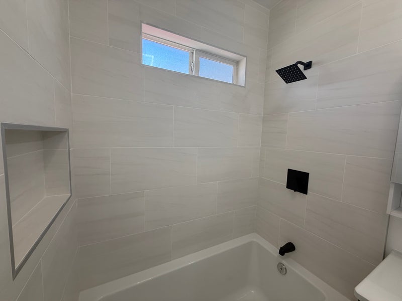 The bathroom offers a soaking bathtub, creating a relaxing retreat after a long day.